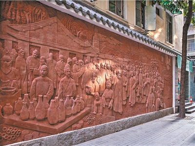 在光塔路进步里,有一面记录蕃坊景象的浮雕墙。(广州日报全媒体记者 苏俊杰)