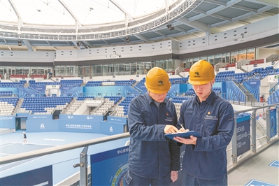 南方电网广东珠海供电局保电人员对十五运会网球赛事场馆的用电设备进行检查,全力保障赛事期间的电力供应稳定。