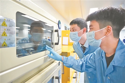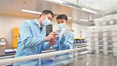 广州银行工作人员(左一)走进生物医药企业开展金融服务。