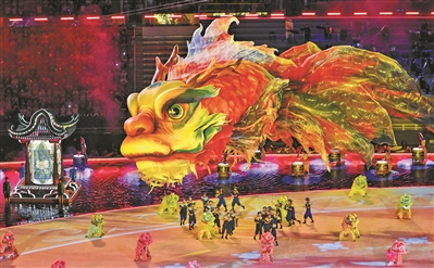 当一众表演者以绳牵引鳌鱼气球静悄悄出场的时候,正是馆内表演转场灯光渐熄之时,金色亮光打在鳌鱼身上,如梦如幻。如今,鳌鱼已成为岭南的文化基因。此次出现在开幕式上的鳌鱼,在保持传统精髓的同时,采用低成本的鳌鱼气球,实现艺术性的同时又兼顾了“节约办赛”。为实现这一段表演,主创团队经过多次试验,才确定了如何调配气球中氮气和氦气的比例,确保鳌鱼能够长时间停留于半空中。