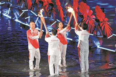 粤港澳大湾区的城市均临海靠水、因水而兴,有“水为财”的说法,开幕式表演以水作为核心表达,水的元素以不同形式呈现贯穿全场,水舞台更是应运而生,令人惊艳。在奥林匹克中心体育场,首次将同心圆与水面舞台结合,借助环形水幕舞台等前沿舞美技术,在体育场内“造出一片海”,“同心圆”意象与体现岭南特色与海洋文明的水舞台灵动特质相融,营造出极具美学特质和哲学意蕴的艺术空间。