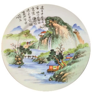 20世纪50年代香港粤东磁厂广彩山水诗文盘 (“百年湾区情——粤港澳大湾区近现代文物展”展品)