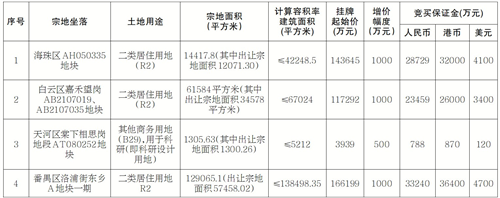 经广州市人民政府批准,广州市规划和自然资源局以挂牌方式出让4宗地的国有建设用地使用权。现将有关事项公告如下: