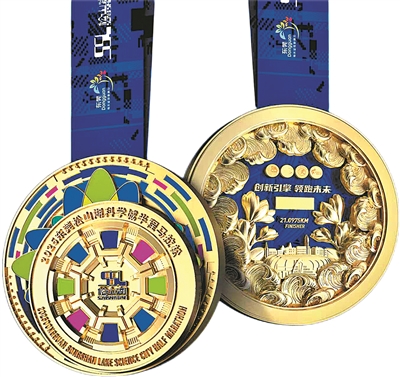 2025松山湖科学城半程马拉松完赛奖牌,设计独具匠心,用手机碰一碰即可呈现松山湖宣传视频。