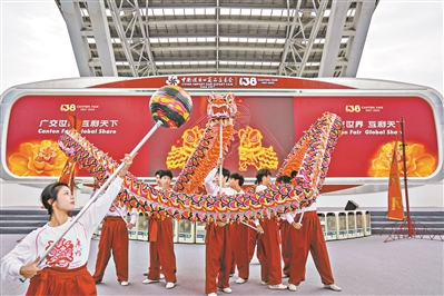 广交会开幕仪式上的舞龙表演。 广州日报全媒体记者吴子良、王燕 摄