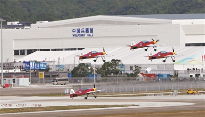 通航展上,中外联袂的飞行表演是压轴戏之一。首日表演中,率先登场的是南非“AERO”特技飞行表演队,这是该飞行表演队首次到珠海参与飞行表演。天幕下,4架世界顶级的特技飞机XA42不断在空中秀出绕轴、对冲、俯冲、开花等动作,伴随拉烟,队伍在空中以彩烟画出一个大心形。由世界冠军级别的队长Mark Hensman领衔,飞行队逐一上演了落叶飘、低空倒飞、低空刀锋侧飞、四机开花、翻滚倒转等高难度特技飞行动作,赢得观众一片惊叹。