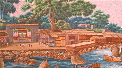 【解说】隋唐以后,广州造船技术更是居于全国领先地位。据《新唐书》记载,唐代广州一地一次就“能造船五百艘”;到了宋代,南方船厂超过3000家。宋朝的《萍洲可谈》一书,这样描述从广州等地出港的远洋船舶:海船大多“深阔各数十丈……货多陶器……舟师识地理,夜则观星,昼则观日,阴晦则观指南针……”大型商船可搭乘上千人,能储存一年的粮食。