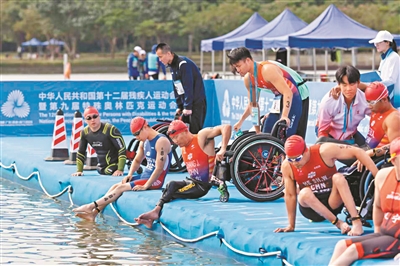 铁人三项比赛在肇庆新区砚阳湖公园举行,这是国内首次举办残疾人“铁人三项”赛事,也是我国首次在残特奥会上正式设立该项目。残特奥会铁人三项比赛包括游泳750米、自行车20公里、跑步5公里,总距离相当于健全人铁人三项的半程标准铁人赛。本届赛事按运动员残疾类型和程度分为10个运动级别,产生19枚金牌。