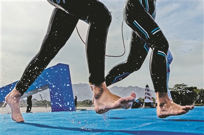 11月27日,肢体组运动员结束游泳环节比赛后上岸准备换项。