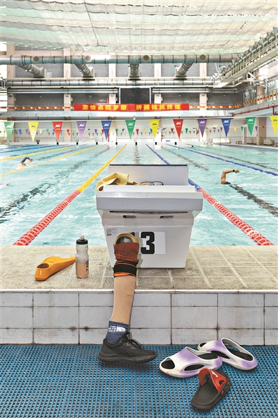 4月24日,广州市残疾人体育运动中心游泳训练馆内,一位肢体组运动员将自己的假肢放在泳池边。