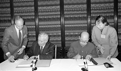 1984年3月21日,王丙乾同志和美国财政部长唐纳德·里甘分别代表两国政府草签协定。 新华社发
