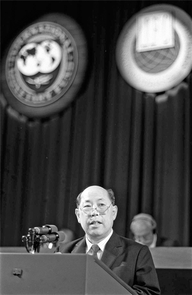 1990年9月25日,国际货币基金组织和世界银行年会在美国首都华盛顿开幕。这是王丙乾同志在会上发言。 新华社发