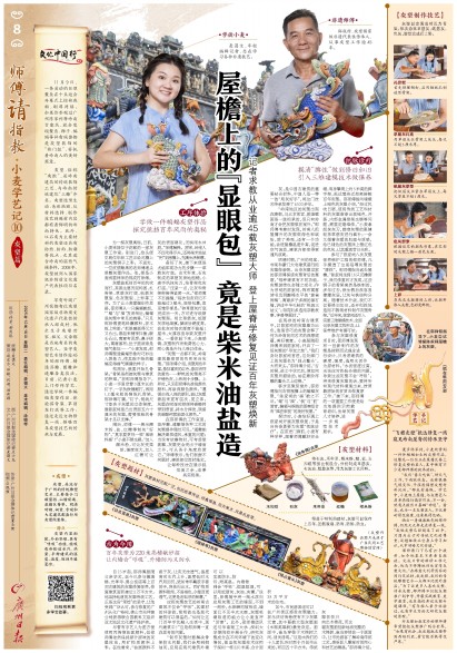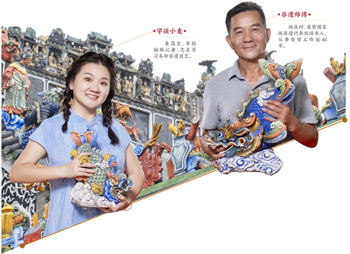 漫步陈家祠,小麦欣赏到一件件栩栩如生的灰塑作品,还瞥见一位位正在屋檐瓦脊上修复灰塑的匠人,其中便有不少是邵师傅的徒弟徒孙。