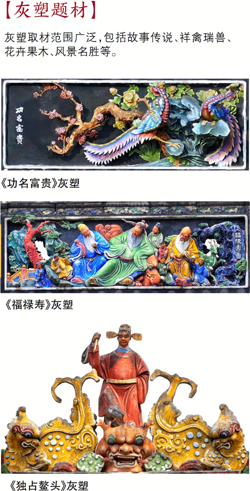 在邵师傅的工作室里,浅浮雕、通雕等各种工艺的灰塑摆件随处可见。“通雕能解决建筑通风、承重的问题;当没有依靠物时,可考虑做圆雕,灰塑完全突出于墙面之外,可从各个角度欣赏它。”师傅表示,他们根据不同题材、建筑部位因材施艺,让每种技法在展示视觉美之余,还兼具实用美。