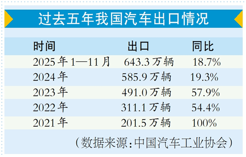 中国汽车工业协会数据显示,11月,我国汽车出口72.8万辆,环比增长9.3%。中国汽车工业协会预计,2025年全年汽车出口有望突破700万辆。