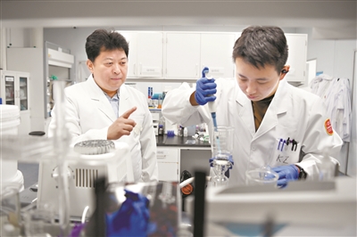 黄浩勇(左)在实验室进行科研指导。