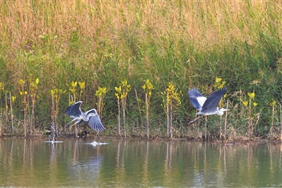 南沙南部片区河涌边,候鸟在嬉戏觅食。广州日报全媒体记者陈忧子 摄