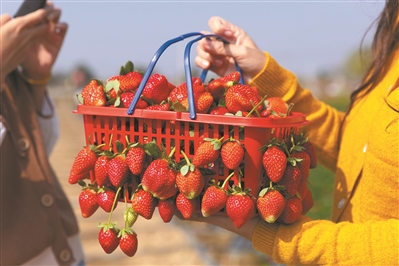 不少市民到田间采摘草莓,收获颇丰。