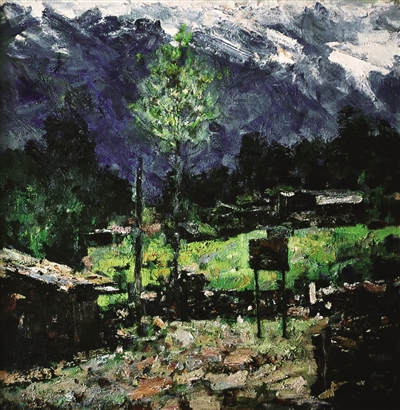 作为陈许写意油画风格的代表作,这幅作品体现了其中西融合的创作语言:技法上,以画刀的堆砌与刮擦替代细腻笔触,将雕塑般的塑形感融入油画,使画面兼具西方表现主义的张力与中国画的写意韵味;色彩上,不拘泥于写实还原,而是运用主观色调传递情绪——蓝灰色的山隐喻偏僻,亮绿色的草地象征生机,暗褐色的房屋则是生活本真的底色,色彩成为独立的情感符号;构图上,将球场置于中后景,以前景的石块与房屋形成框景,既突出了体育设施的核心意象,又使场景自然融入山村环境,避免了主题表达的刻意。