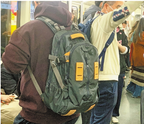 鼓胀的双肩包在地铁车厢中容易给他人带来不便。