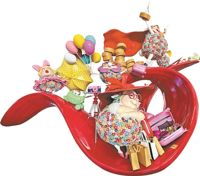 在T3航站楼出发厅里,有一组新五羊雕塑也颇为吸睛。这件作品名称为《喜洋洋之南方吹来的风》,由中央美院艺术家团队打造。作品中五只羊的身材比较圆润,穿着花花衣服,十分时尚,旁边还有相机、旅行箱等装备。令人觉得有趣的是,如同“全家福”的五只羊旁边,还有一串串蒸笼,叉烧包虾饺烧卖等广式点心让人想到了广州的美食。这件艺术作品既有岭南味,又有烟火气。