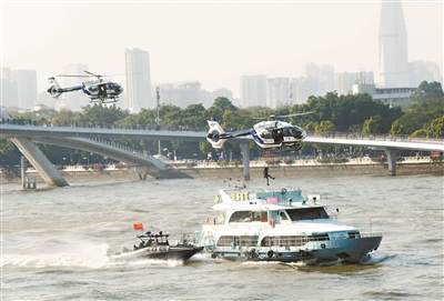 水陆空全域协同警务实战演练、江面反走私拦截、落水人员救援、无人机投放救生设备……超“燃”实战演练展示广州公安“水陆空”全域立体化巡逻防控体系建设成果。