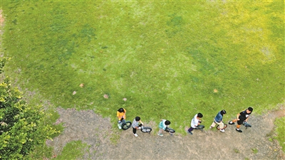 2025年10月10日,白云区心源户外活动基地,金刚带学生在户外草地上骑行。