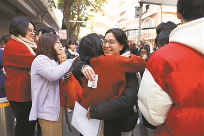 1月10日,广州市海珠外国语实验中学考点,考生进入考场前与前来送考的老师拥抱。