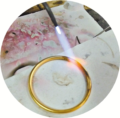 真金不怕火炼,为何足金也会被烧黑?全国职业技能竞赛珠宝加工赛项裁判长、裁判员郭志鹏向记者现场演示了黄金回收行业中隐蔽的欺诈手段。只见他将洗洁精涂抹在黄金手镯上,随后用纯蓝的火焰灼烧手镯,结果黄金手镯的表面出现发黑现象。郭志鹏说:“不良商家在接过顾客的黄金时,可能会将无色无味的洗洁精预先抹在手上,接触黄金时轻轻涂抹。由于洗洁精透明无色且涂抹均匀,顾客通常难以察觉。如果用火灼烧表面被涂抹了洗洁精的真金,它也会变黑。”