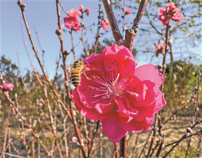 石马村的桃花田里,蜜蜂在桃花中采蜜。