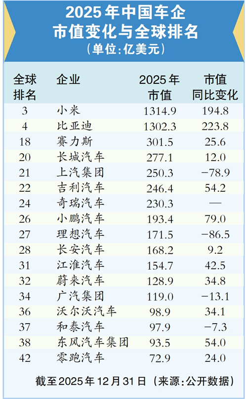 2025年,中国车企在全球舞台表现亮眼。小米以1314.9亿美元的市值微超比亚迪的1302.3亿美元。机构分析认为,两者的位置变化,凸显“生态溢价”与“制造溢价”已成为市场新的估值逻辑差异。