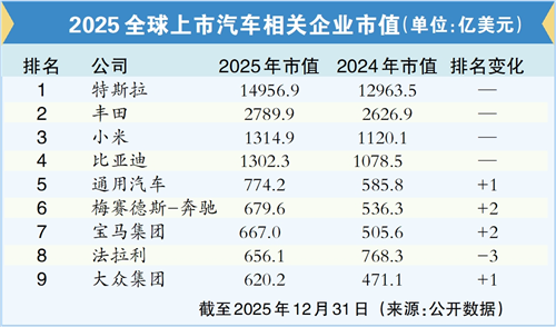 截至2025年12月31日,全球车企市值榜单呈现“头部稳如磐石、中后段剧烈洗牌”的特征;中国车企在分化中强势突围,传统豪华品牌估值持续承压,产业正从“机械制造”向“科技生态”加速迭代,为2026年的行业竞争埋下重要伏笔。