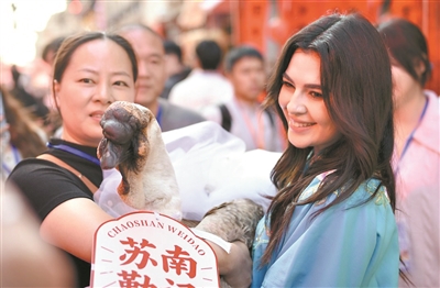 国际网络达人与汕头狮头鹅亲密接触。(主办方供图)