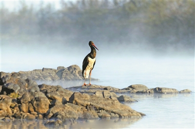1月9日,冬日的暖阳洒在锦江水面,波光粼粼。在丹霞山宽阔的河岸浅滩处,一道黑白分明的身影闯入了监测人员的视线。这是一只体态高雅的大型涉禽,它有着鲜红的长喙与修长的红腿,在碧水中显得格外醒目。
