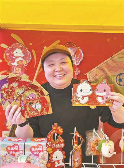 记者在现场看到,有融合岭南剪纸元素的“大湾鸡”红包套装,定制版鸡仔饼、酥糖等年货,融入广府骑楼、木棉花等地域符号的限量版手办,还有交通卡等。