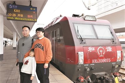 昨日上午,部分旅客在K303次列车旁合影留念。广州日报全媒体记者陈忧子摄