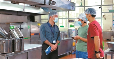 广州市纪委监委将“校园餐”问题整治作为重点,推动在全省率先出台校外供餐管理工作指引,全面实现“互联网+明厨亮灶”智慧监管,开展学校大宗食材集采集配改革。图为花都区纪委监委工作人员前往辖内学校了解“校园餐”相关管理规定落实情况。