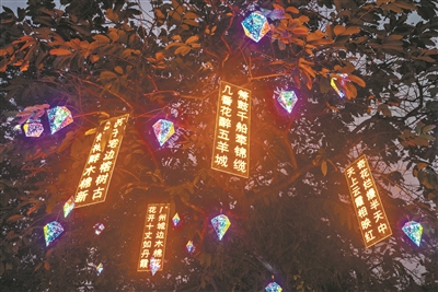 名篇佳句以玲珑灯牌错落悬挂于枝头。廖雪明摄