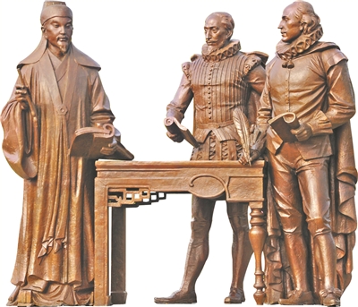 位于江西省抚州市“三翁”花园的汤显祖(左)、莎士比亚、塞万提斯雕像