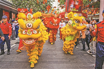 今年,越秀西湖花市将广绣、打铜、饼印、榄雕、醒狮、通草画、广彩、广钟等非遗瑰宝融入花市场景,以创新表达活化非遗传承,让千年广府文化在百年花市中焕发出璀璨光彩。