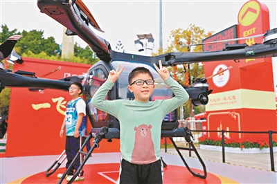 天河花市,小朋友与飞行汽车合影。 广州日报全媒体记者邓莉 摄