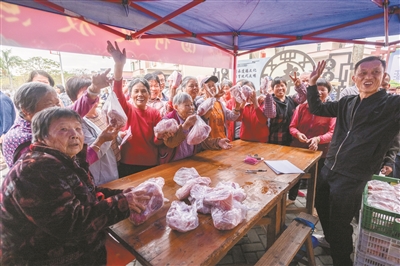 龙岗村长者开心领猪肉。广州日报全媒体记者庄小龙 摄