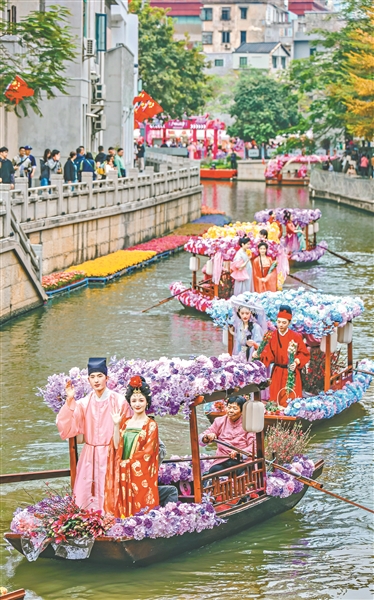 2月12日,装饰精美的花船巡游荔枝湾涌,吸引了两岸的游客驻足观看。广州日报全媒体记者廖雪明摄