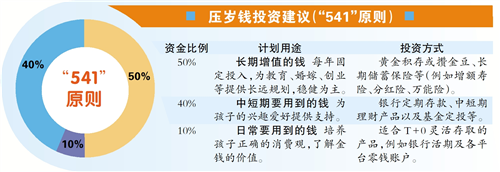“和孩子一起打理压岁钱,最重要的是让孩子认识到金钱和时间的关系。”某股份制银行理财顾问表示,将压岁钱当作孩子的“成长基金”,不妨将资金分为3份进行规划,按照“541原则”进行管理:50%用于长期增值,相当于提前给孩子养“金鹅”;40%用来实现未来3—5年可预见的旅游、教育等目标,减轻未来资金压力;10%用于日常开销,即短期消费。