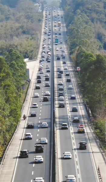 春运返程,许广高速清远六甲洞隧道路段启动长距离“借道通行”管控,南下车流有序行驶。