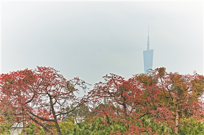 二沙岛,木棉花与广州塔同框。广州日报全媒体记者陈忧子 摄