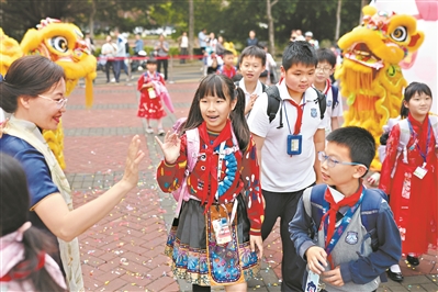 昨日,华南师范大学附属小学不少师生身穿汉服、旗袍等中华传统服饰,欢聚校园,参加春季开学典礼。