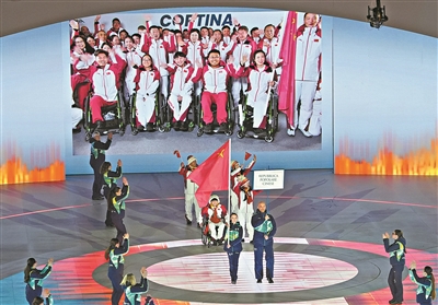 中国代表团当晚第14位入场,现场大屏幕同时展示了科尔蒂纳、米兰与泰塞罗的中国代表团成员们向观众及队友致意的画面。此次中国代表团运动员共70人,将参加全部6个大项中的71个小项比赛,这是我国参加境外冬残奥会项目最多、运动员规模最大的一届。