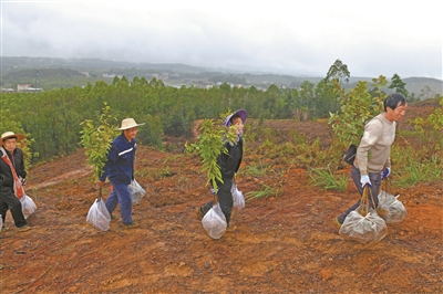 广州日报讯 (全媒体记者叶卡斯 通讯员林荫)春回大地,万物勃发,正是植树造林的黄金时节。在云浮罗定市罗平镇乌龙村千亩级森林景观大斑块造林项目现场,200余名造林人员分工协作、干劲十足,打穴、放苗、扶正、培土、踩实,一道道工序有条不紊,一棵棵新苗迎着春光扎根沃土,南粤大地处处涌动着播绿添翠的热潮。