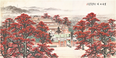 英雄花与革命圣地的交融,首推农讲所。这座番禺学宫旧址,红墙黄瓦,棂星门旁两株百年木棉年年如约绽放。黄志坚1991年创作的《农讲所红棉分外红》,以前景木棉为主体,用笔苍劲,花朵如燃烧的火焰;杨之光所作《红日照征途》,画面右上角两株火红木棉自大成门屋檐后探出,寄寓前景之光明;陈章绩笔下的农讲所,赭红墙垣与木棉交相辉映,点景人物中藏族同胞的身影遥相呼应,暗喻革命星火从广州燃向边疆。